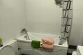 -Современный санузел: ванна, стиральная машина, зеркало, полотенцесушитель.